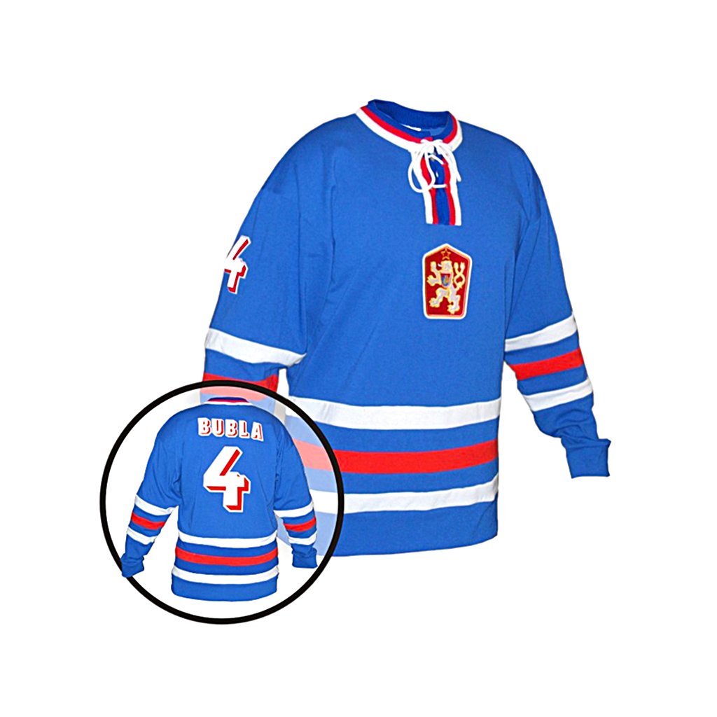 Modrý hokejový dres s výšivkou lvíčka na prsou, který materiálově a střihově odpovídá dresu, ve kterém pravidelně nastupovala úspěšná generace nešich reprezentantů v sedmdesátých letech minulého století.