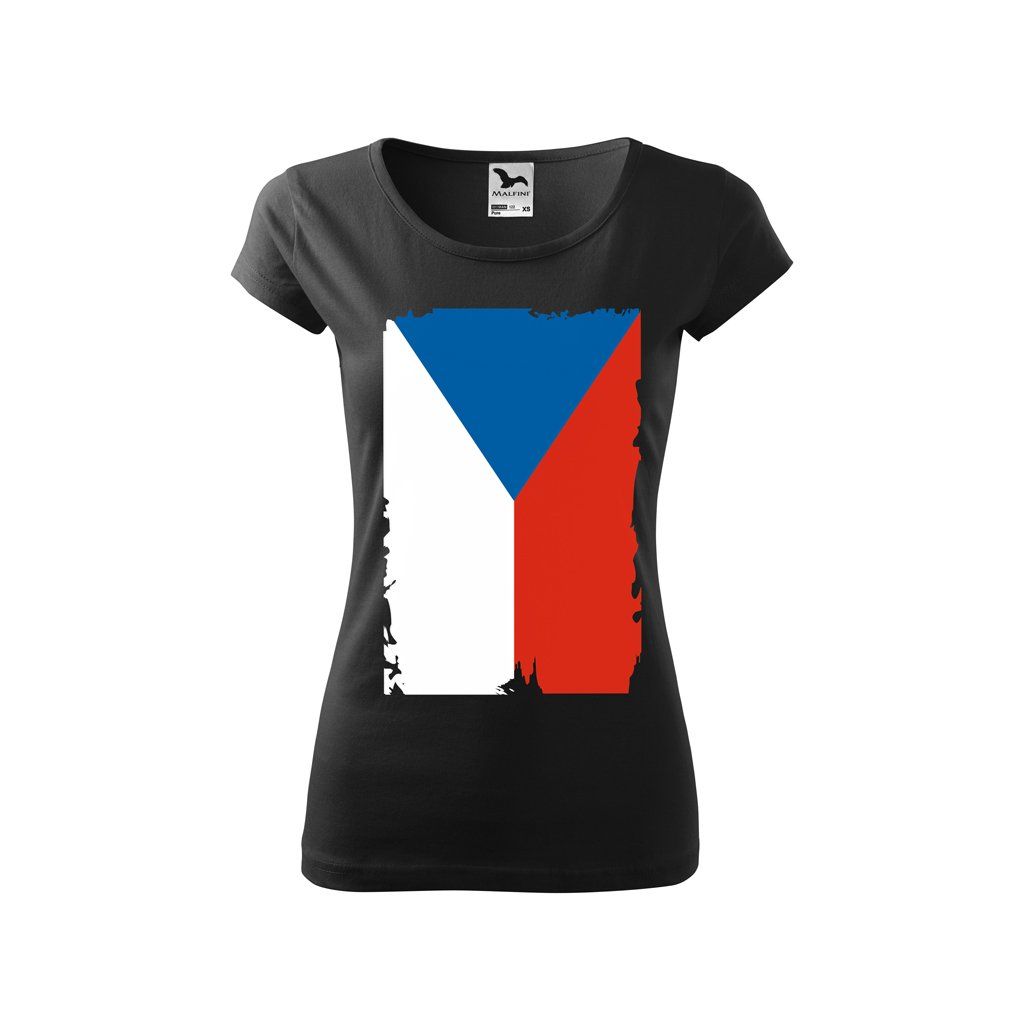 Dámské tričko s krátkým rukávem a potiskem s českou vlajkou je klasikou mezi oblečením pro milovnice České republiky a fanynky všech našich sportovců. Na černém podkladu vlajka krásně vynikne. Díky výrazné barvě se hodí ke všem možným doplňkům s českou tématikou.
